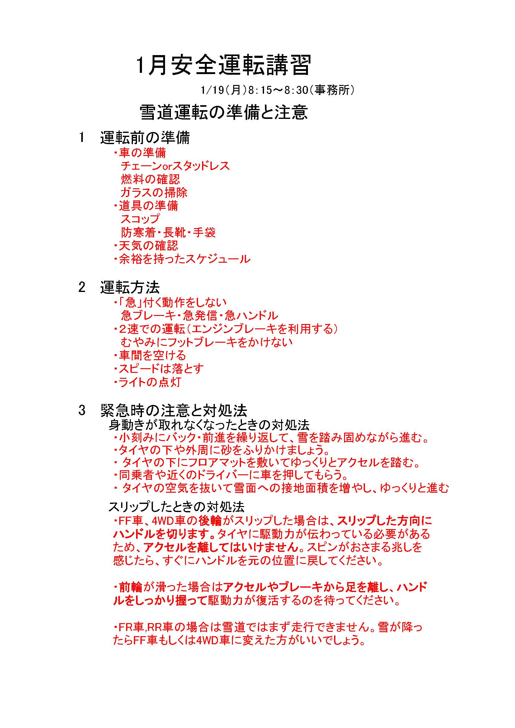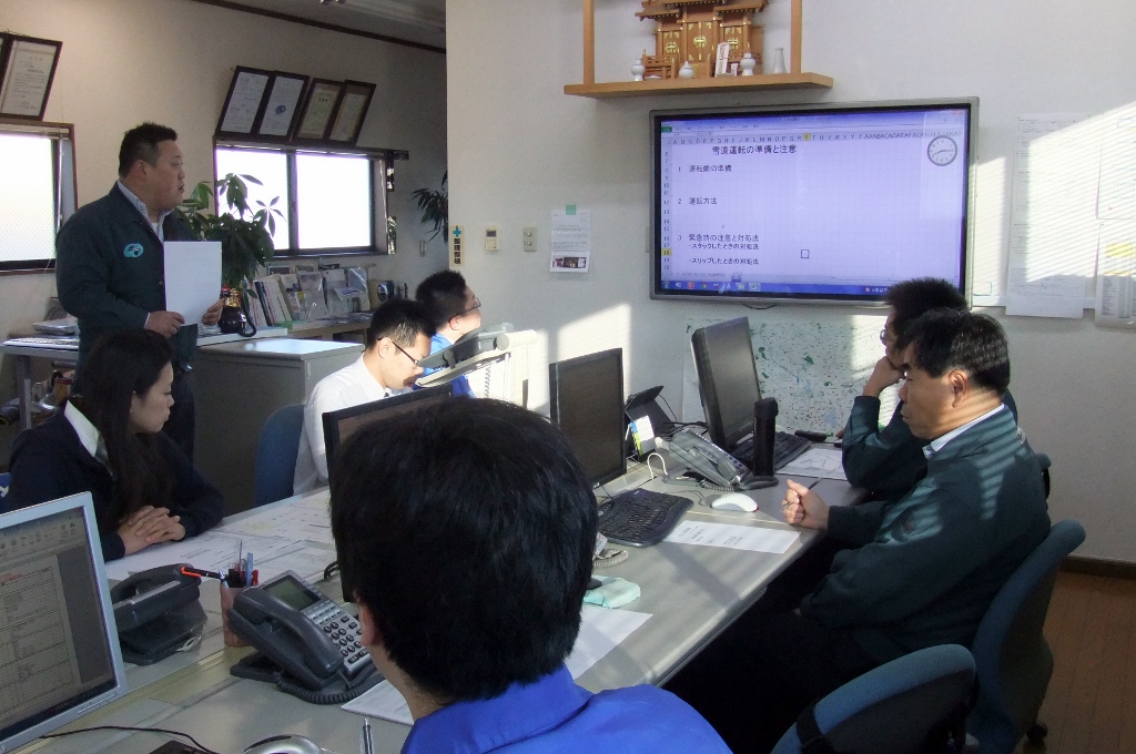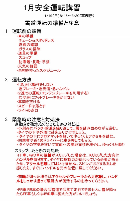 1/19(月)に事務所で実施しました。今回のテーマは「雪道運転の準備と注意」です。