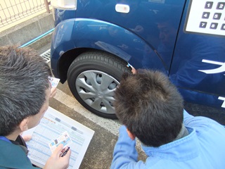 ●タイヤ点検: 1番ミゾの少ないところをチェックシートを使って点検。
